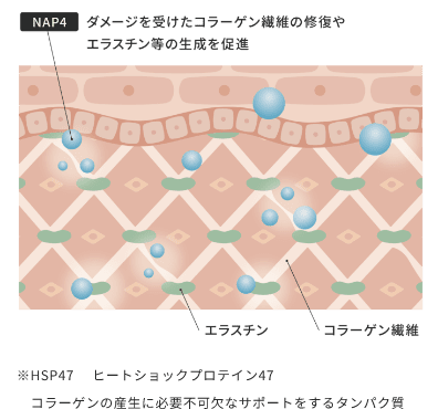 - そうした素肌力の低下を防いで回復させていくために、ダメージを受けたコラーゲン線維やエラスチン、ヒアルロン酸、HSP47(※)、肌を酸化から守るグルタチオンなどの新たな生成や修復を促進、活性化させて肌老化を防ぎ、肌の内側からみずみずしい潤いとつや、しなやかなハリ弾力を作り出します。